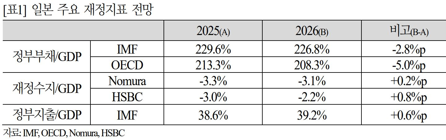 ㅇ GDP 개선 속도가 재정수지 악화 속도보다 빨라 재정수지가 소폭 개선될 것으로 전망되고 있으나, 다카이치 행정부의 공격적인 확장적 재정정책이 재정적자를 예상보다 악화시킬 가능성