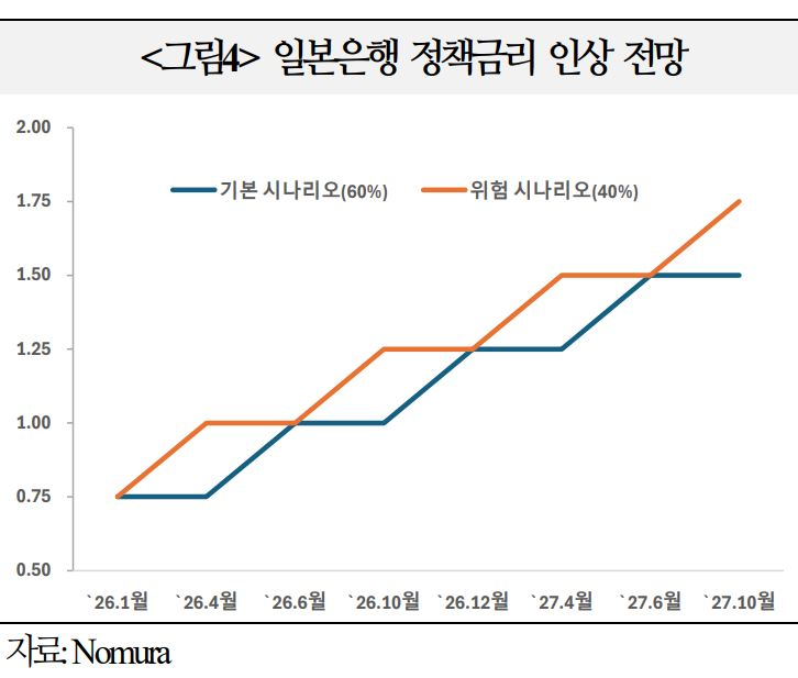 - 장기금리 상승과 재정 리스크가 맞물려 엔화 약세가 심화될 경우 수입물가 상승을 통해 일본은행의 긴축 압력이 커질 수 있으나, 금리 인상은 국채 이자비용 증가로 이어져 재정 부담을 가중시킬 우려