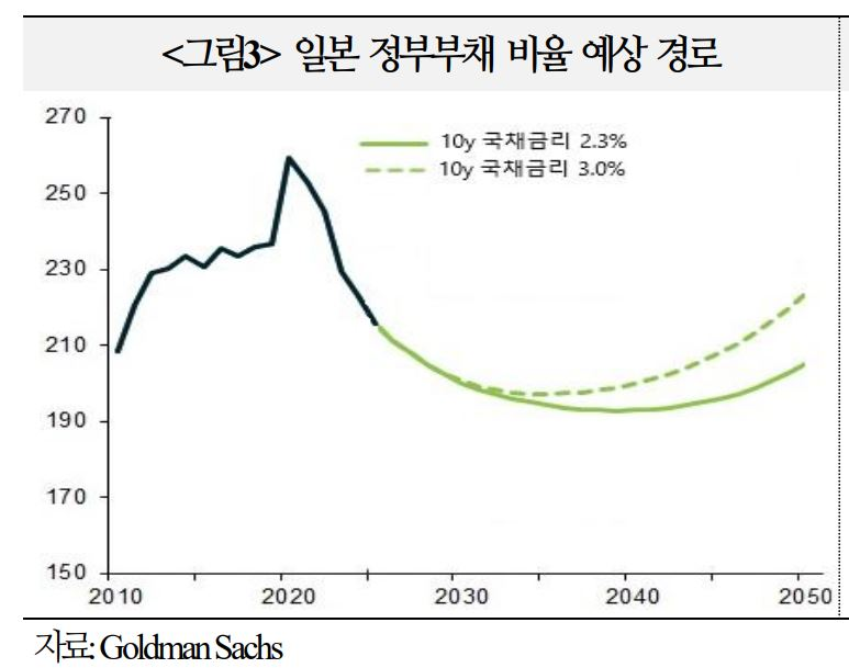 - 10년물 국채금리가 약 0.8%p 상승하여 3%에 도달할 경우, 평균 조달금리 상승을 통해 부채비율의 자연적 하락 경로가 조기 종료될 소지(Goldman Sachs)