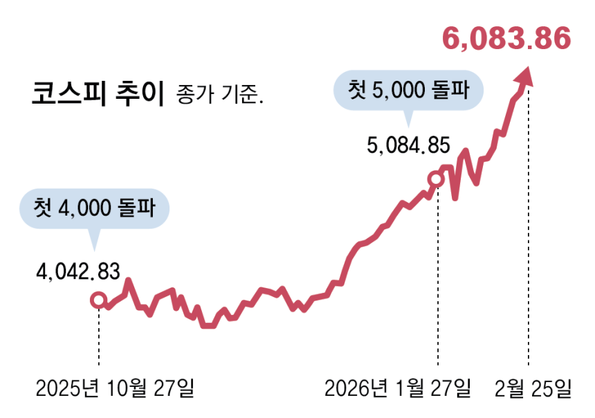 2026년 2월 25일, 코스피가 종가 6083.86으로 마감하며 코스피 6000 시대란 전인미답의 고지를 밟았습니다. 4000을 돌파한 지 넉 달, 5000을 넘어선 지 한 달도 채 되지 않은 시점에서의 6000 돌파는 단순한 숫자의 경신이 아니라 대한민국 자본시장의 구조적 대전환을 선언하는 사건이 아닐 수 없습니다.