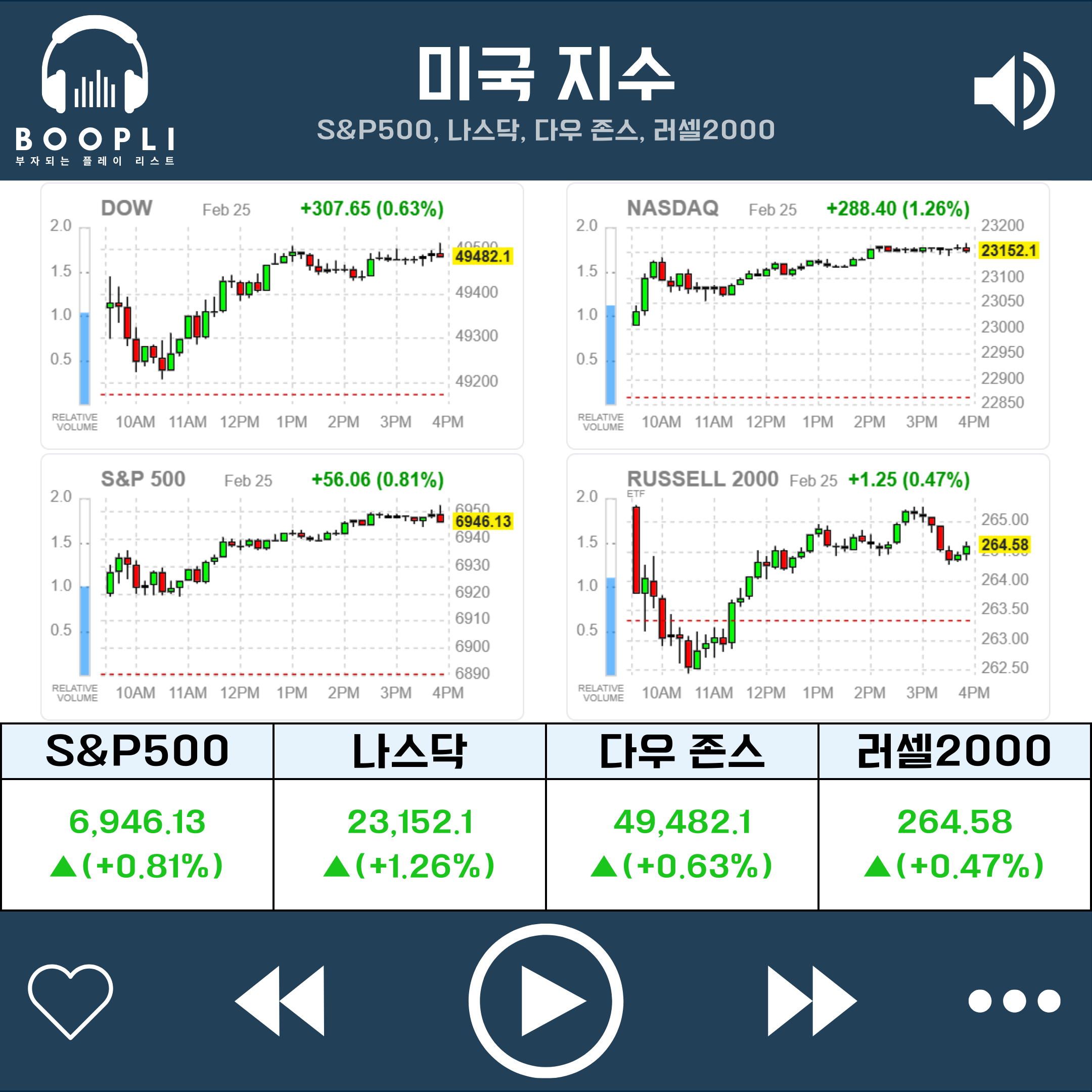 전일 미국 증시는 엔비디아 실적 기대감과 인공지능(AI) 공포 완화, 암호화폐 시장 강세 등 위험자산 선호 심리가 회복된 가운데 나스닥(+1.26%), S&P500(+0.81%), 다우(+0.63%), 러셀2000(+0.47%) 등 주요 지수 모두 상승 마감