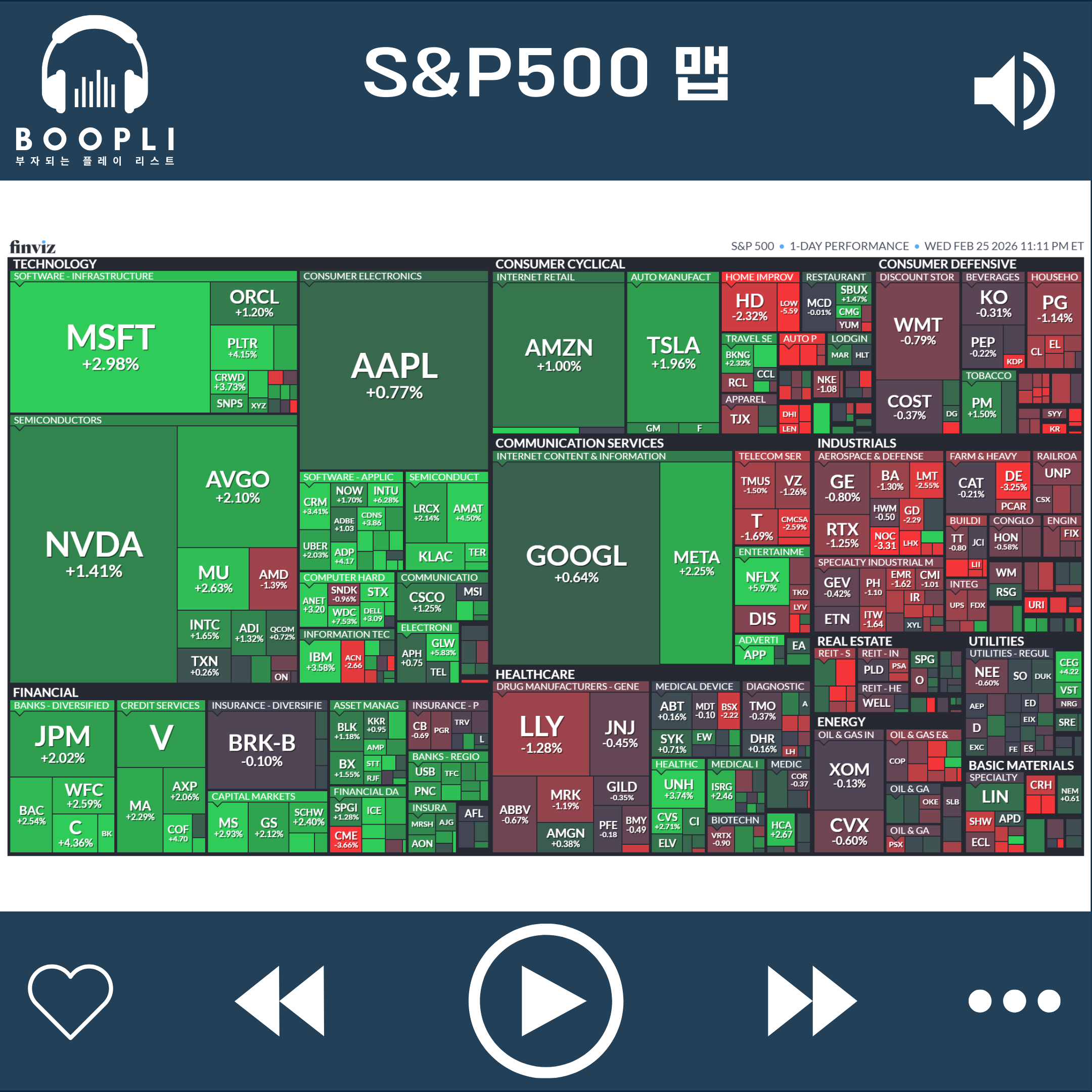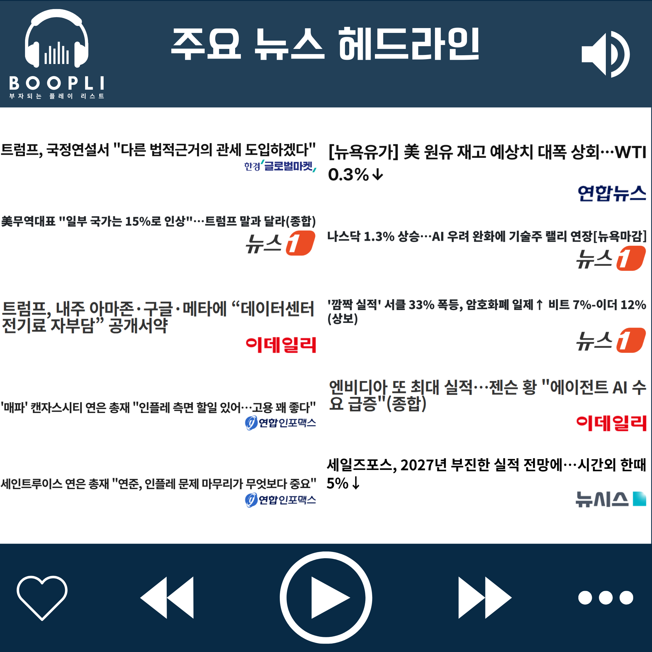 개장 전에는 트럼프 대통령이 국정연설을 통해 새로운 법적 근거를 바탕으로 추가 관세 도입 의지를 피력했으나, 제이미슨 그리어 미국 무역대표부(USTR) 대표가 일부 국가에 한해 15% 인상을 적용할 것이라며 톤을 조절한 덕분에 정책 불확실성이 다소 제어되는 모습을 보임