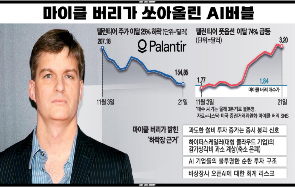 AI버블은 마이클 버리가 팔란티어나 엔비디아 같은 주식이 비정상적이게 주식이 과열되어 있다고 경고하면서 주목받았다. 그는 AI 관련 기업들이 단기간에 별거 아닌 재료들로 수백~수천 %나 상승하면서 비정상적으로 시가총액이 부풀려져 있다고 말했다. PER(주가수익비율)이 과거 평균 대비 크게 상승하고 "미래성장"을 현재 가격에 선반영하면서 실제 수익을 내는 것은 없는데, 꿈과 희망으로 주가를 상승시켰다는 것이다. 양자컴 관련주나 SMR, 아리스타 네트웍스 같은 네트워크 관련 주들도 포함된다.