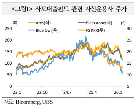 – 사모대출 펀드를 운용하는 Ares Management, KKR & Co, Apollo Global Management, Blackston, TPG 등의 주가도 하락세를 지속(`26.2.18일→ 2.23일 대부분 14~15% 급락)