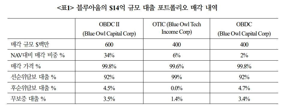 ㅇ 이후 Saba 캐피탈, Cox 캐피탈 등 AUM $3~6억인 소형 운용사에서 블루아울의 사모신용 펀드 지분 매입(tender offer) 의사를 타진했으며, 제시가격이 NAV의 20~35% 할인된 가격이었다고 알려지며 사모대출 부실에 대한 의구심이 제기