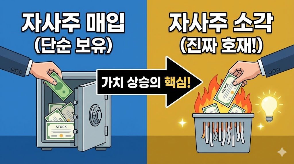 진짜 호재는 매입한 자사주를 아예 없애버리는 '소각'**입니다. 시장에 유통되는 전체 주식 수가 영구적으로 줄어들기 때문에,