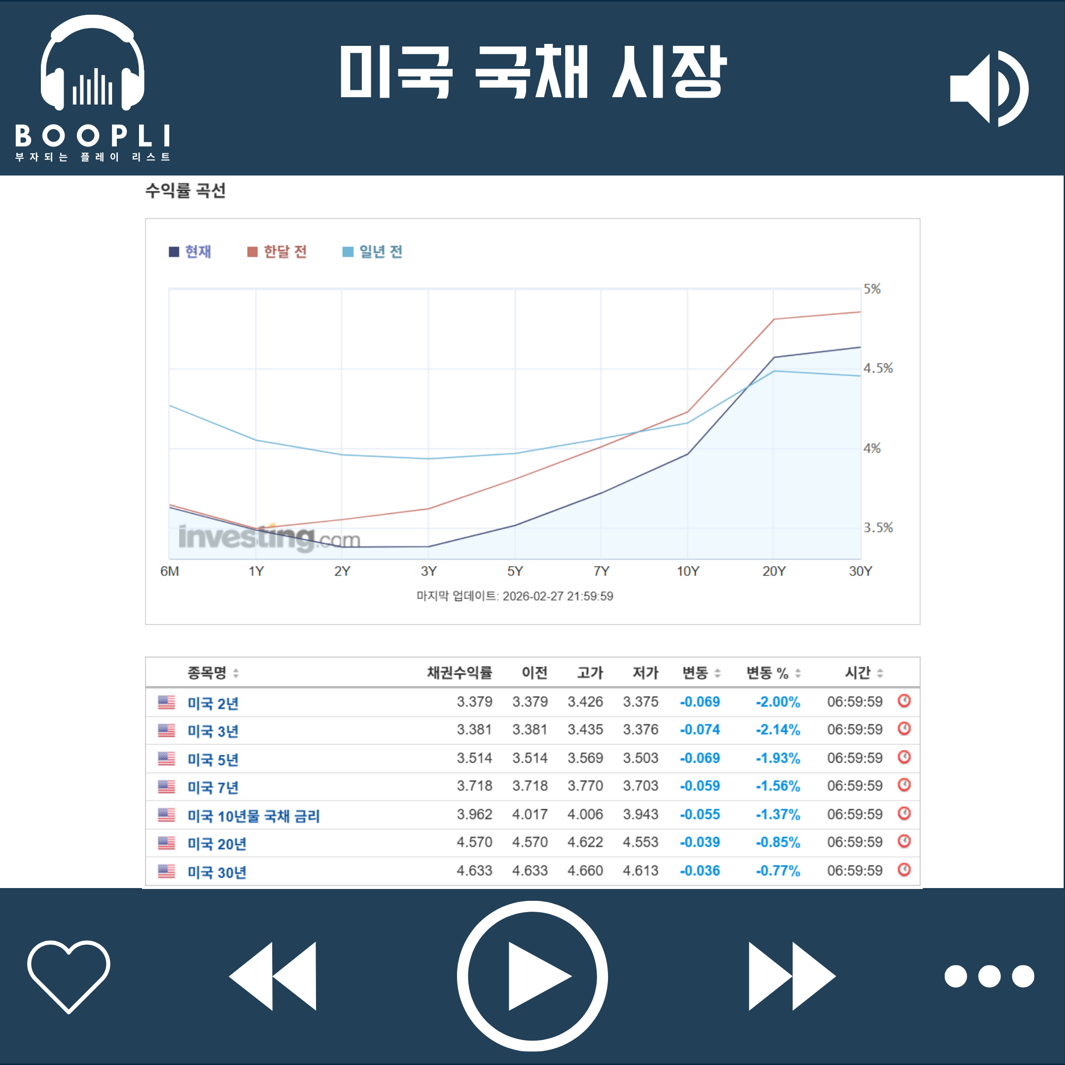 미국 국채는 1월 생산자물가지수(PPI) 상승으로 물가 반등 우려가 부각되었으나, AI 수익성 우려와 고용 둔화 가능성 부각, 사모신용 시장 리스크, 미-이란 핵 협상 결렬 등 이슈로 안전자산 수요가 집중되며 장단기 금리 모두 하락