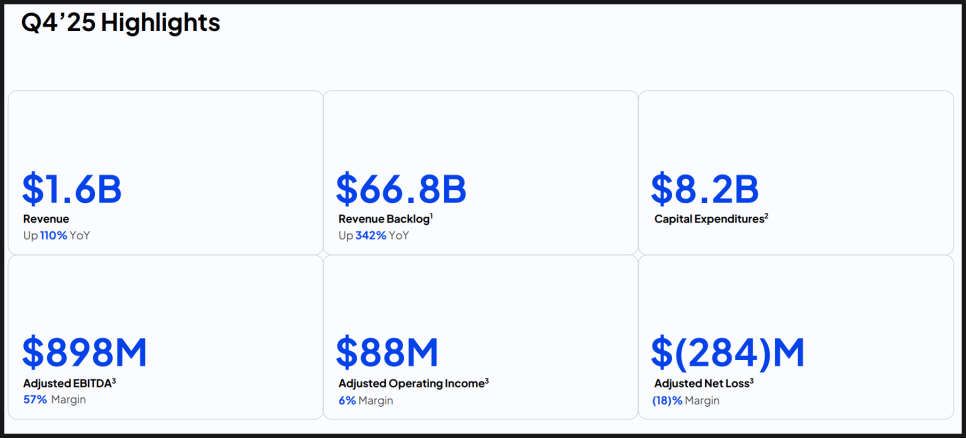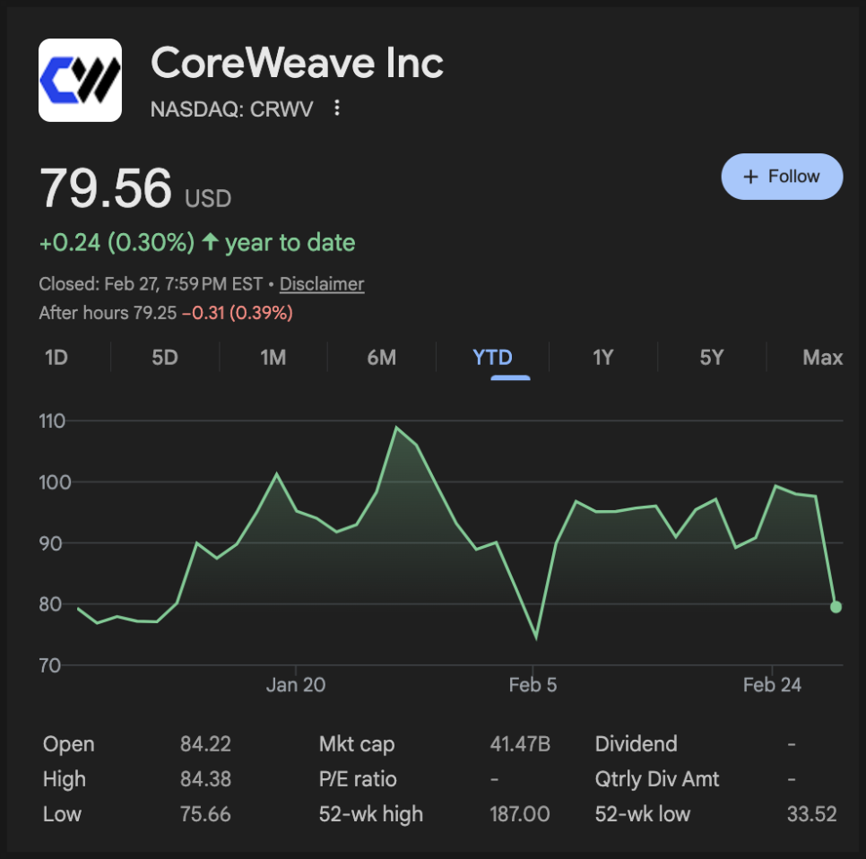 코어위브는 2025년 3월 상장 이후 “AI 인프라 슈퍼사이클”에 베팅하는 대표 종목이 됐습니다. 엔비디아가 20억 달러를 추가 투자한 점도 강한 후광 효과였습니다. 올해 들어 실적 발표 전까지 주가는 36%나 올라 있었습니다. 기대가 상당히 높았던 상태였습니다. 오랜 기간 이어진 조정이 끝나고 제대로 상승세 전환에 대한 기대감이 부풀었죠.