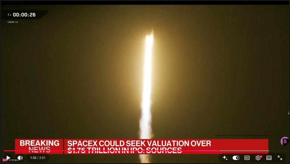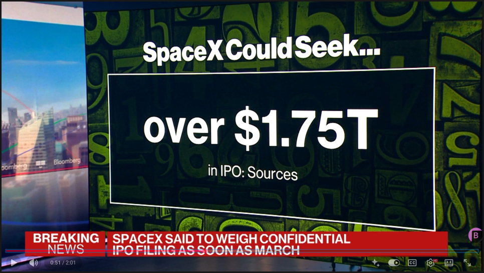다음 소식은 스페이스X 이슈입니다. 블룸버그 보도에 따르면 스페이스X가 이르면 3월에 비공개로 IPO 신청서를 제출할 수 있다고 합니다. 비공개 제출이라는 건, 먼저 미국 증권거래위원회와 내부 검토를 거친 뒤 나중에 내용을 공개하는 방식입니다. 일정이 순조로우면 6월 상장도 가능하다는 계산입니다.