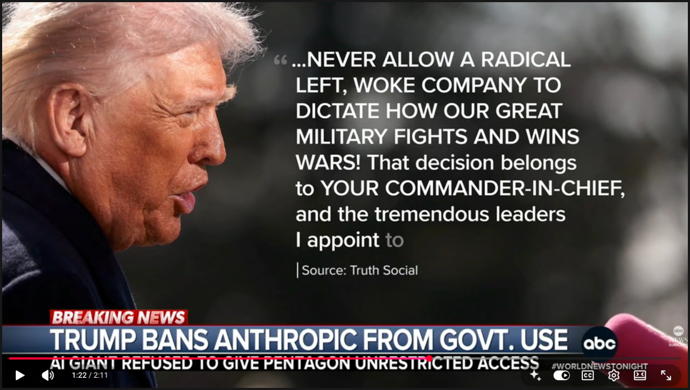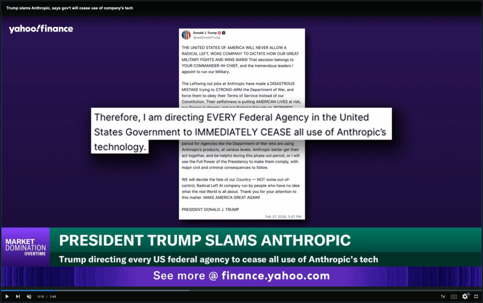 모든 연방 기관에 앤트로픽 기술 사용을 중단하라고 지시했고, 6개월 안에 협조하지 않으면 더 강한 조치를 취하겠다고 한 거죠.