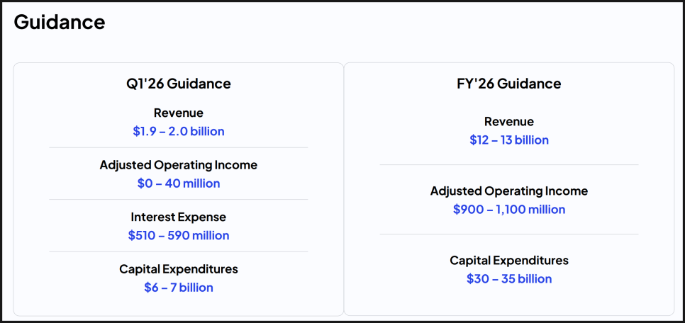 둘째, 가이던스도 아주 강하다고 보긴 어렵습니다. 올해 매출 전망은 120억~130억 달러로 제시했는데, 1분기 매출은 약 20억 달러로 예상했습니다. 시장 예상보다 약간 낮은 수준입니다. 조정 영업이익도 거의 손익분기점 수준입니다.
