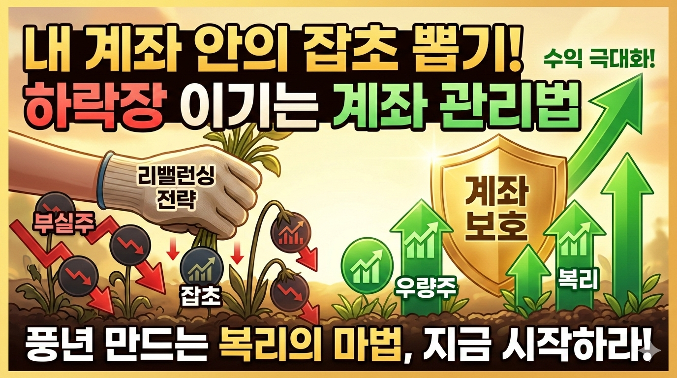 리밸런싱은 하락장에서 계좌 손실을 방어하고, 상승장으로 전환될 때 더 빠르게 수익을 극대화하는 복리의 무기입니다. 내 소중한 자산을 지키고 싶다면, 오늘 당장 계좌 안의 잡초(부실 종목)를 과감히 정리하고 꽃(우량 종목)의 비중을 조절하는 습관을 들이시길 바랍니다.
