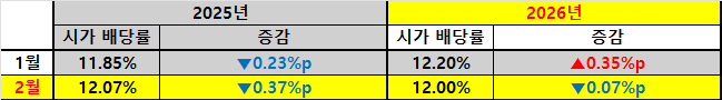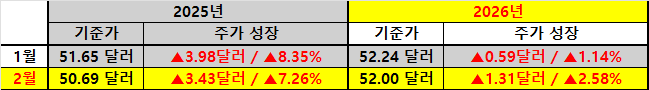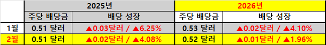 단순히 이번 달의 수치뿐만 아니라 전년 동기 대비 성적을 살펴보면 더욱 긍정적인 신호를 발견할 수 있는데 2025년 2월의 주당 배당금인 0.51달러에서 올해는 0.01달러가 증가하며 약 1.96%의 배당 성장을 기록했습니다. 이와 동시에 기준 주가 역시 작년 50.69달러에서 올해 52.00달러로 약 2.58% 상승하며 자본 차익 측면에서도 준수한 성과를 거두었습니다. 주가 상승으로 인해 시가 배당률 자체는 작년 대비 0.07%p 소폭 하락하였으나 자산 가치와 분배금이 함께 우상향하는 ‘건전한 흐름’을 보여주고 있다는 점에서 매우 만족스럽습니다.