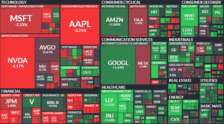 섹터별 움직임을 살펴보면 기술주 중심의 하락세가 매우 가파르게 나타났습니다. 엔비디아가 4% 넘게 급급락하고 애플과 마이크로소프트 등 시가총액 상위 종목들이 일제히 하락하며 지수를 끌어내렸습니다. 특히 반도체 섹터의 전반적인 조정은 인공지능에 대한 기대감과 실적 부담 사이의 갈등을 보여줍니다. 반면 헬스케어 섹터에서는 일라이릴리와 애브비 등이 상승하며 시장의 피난처 역할을 수행했고 필수 소비재 부문의 월마트와 코스트코 역시 견조한 상승세를 보이며 방어주로서의 면모를 과시했습니다. 금융 섹터 내에서도 제이피모건과 골드만삭스 등 대형 은행주들이 약세를 보인 것과 달리 버크셔 해서웨이는 소폭 상승하며 자본의 견고함을 증명했습니다. 에너지 섹터는 중동의 긴장감이 고조됨에 따라 유가 상승 기대가 반영되며 일부 종목에서 매수세가 유입되는 차별화된 흐름을 보였습니다.