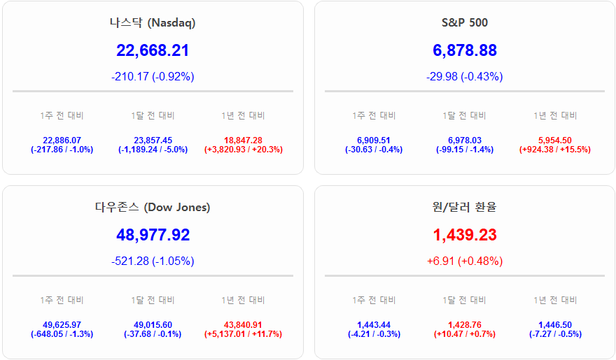 현재 금융 시장은 불확실성의 파고를 넘기 위해 극도의 긴장 상태를 유지하고 있습니다. 나스닥이 22,668포인트로 하락하고 S&P 500 역시 6,878포인트 선에서 조정을 받으며 주요 지수들이 전반적으로 약세를 보이고 있습니다. 다우존스 지수는 1% 넘게 하락하며 시장의 전반적인 투매 분위기를 반영했고 원/달러 환율은 1,439원까지 치솟으며 달러 강세가 투자 심리를 더욱 압박하고 있습니다. 시장 참여자들의 심리를 대변하는 공포와 탐욕 지수는 43을 기록하며 공포 구간에 진입했습니다. 이는 중동의 지정학적 리스크와 기술주 섹터의 밸류에이션 부담이 겹치며 투자자들이 공격적인 매수보다는 자산 보호를 위해 한 발 뒤로 물러나 있는 상황임을 명확히 보여줍니다. 환율의 급등은 원화 기준 자산을 보유한 투자자들에게는 일종의 방어막이 되기도 하지만 거시 경제 전반에는 큰 부담으로 작용하고 있습니다.