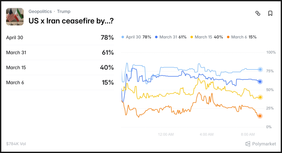 미·이란 휴전이 3월 2일까지 이뤄질 확률은 4%, 3월 6일까지는 15%에 불과합니다. 그런데 3월 31일까지는 61%, 4월 30일까지는 78%로 뛰어오릅니다. 즉, 베팅 참가자들은 수개월 장기전보다는 몇 주 안에 어느 정도 정리가 될 가능성에 무게를 두고 있습니다. 비트코인이 6만 8천 달러까지 반등한 배경과도 같은 맥락입니다.