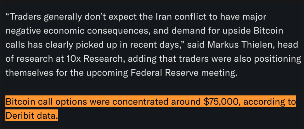 그렇다고 시장 전체가 비관론만 있는 것은 아닙니다. 일부는 “이번 전쟁 이슈가 경제에 장기적인 부정적 영향을 미치지는 않을 것”이라는 시각도 있습니다. 이런 관점에서 일부 트레이더들은 반등을 기대하며 상방 콜 옵션(상승 베팅)에 관심을 보이고 있습니다. 실제로 비트코인 콜 옵션은 7만5천 달러 근처에 수요가 모여 있다는 기록도 있습니다.