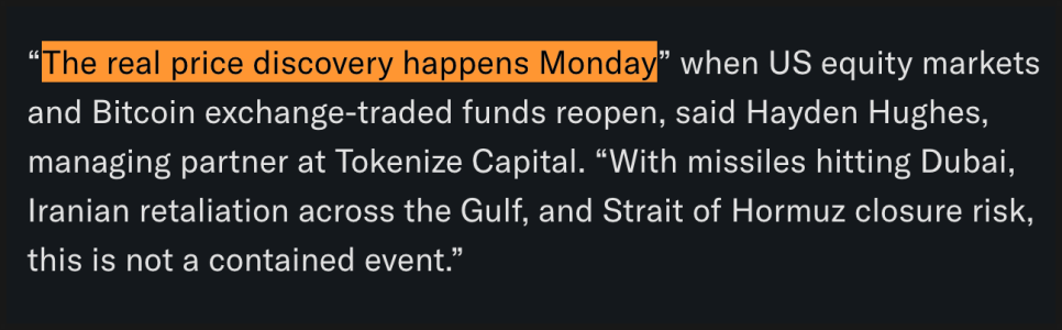 토큰화 자산 운용사 토크나이즈 캐피털(Tokenize Capital)의 헤이든 휴스(Hayden Hughes) 파트너는 “진짜 가격 방향 월요일이 돼야 알 수 있을 것”이고 말했습니다. 미국 주식시장과 비트코인 상장지수펀드(ETF) 시장이 주말 동안 닫혀 있었기 때문에, 전통 금융시장이 다시 열릴 때 투자자들이 진짜 방향을 정리할 것이라는 의견입니다. 특히 두바이 등 걸프 지역까지 미사일과 보복 공격이 이어지고 있고, 호르무즈 해협이 폐쇄될 위험까지 제기되고 있어 상황이 쉽게 정리될 국면은 아니라는 설명입니다.