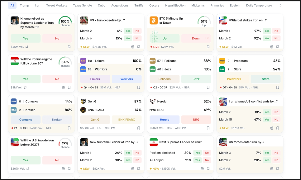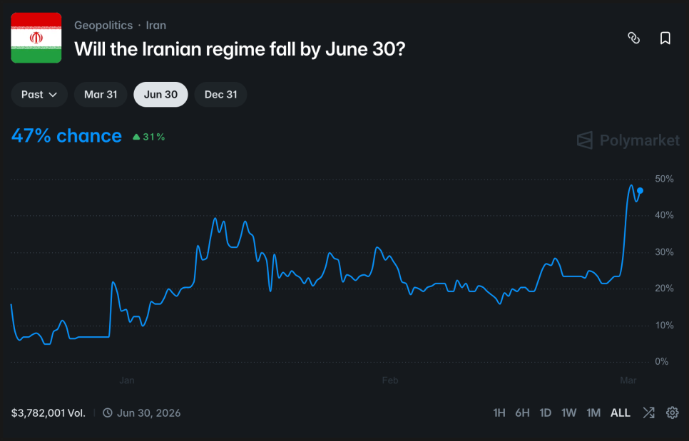 한편 암호화폐 기반 예측시장 플랫폼 폴리마켓(Polymarket)이 이번 미국 이란 전쟁 이슈로 사상급 거래량을 기록했습니다. 단순히 전쟁이 날까 말까를 넘어서, 휴전 날짜, 정권 붕괴 시점, 심지어 미군 지상군 투입 여부까지 베팅이 쏟아지고 있습니다. 말 그대로 전쟁이 하나의 실시간 거래 시장이 된 셈입니다.