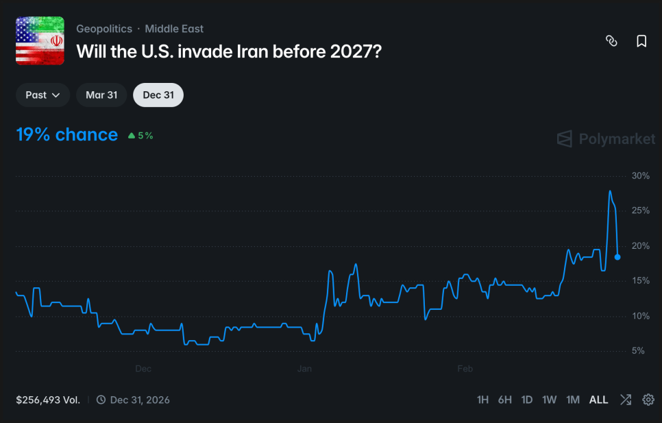 미군 지상군 개입에 대한 베팅도 적지 않습니다. “2027년 이전 미국이 이란을 침공할까?”는 19%, “3월 7일까지 미군이 이란에 진입할까?”는 28%로 형성돼 있습니다.