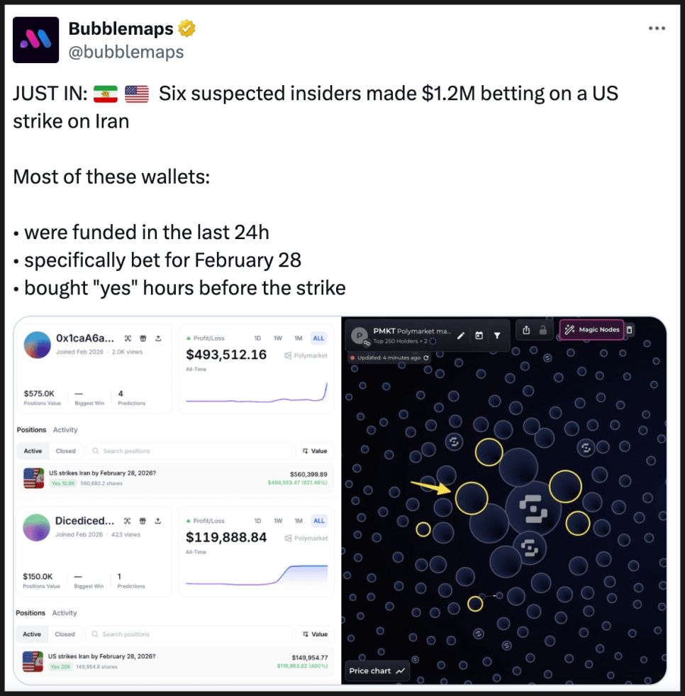 온체인 분석업체 버블맵스(Bubblemaps)는 공습 직전 24시간 내에 자금을 입금하고, 정확히 2월 28일 공습 계약에만 집중 베팅해 약 120만 달러를 벌어들인 여섯 개 지갑을 포착했습니다. 가장 큰 지갑은 약 6만 1천 달러를 49만 달러 이상으로 불렸고, 또 다른 지갑은 3만 달러로 약 12만 달러 수익을 냈습니다.