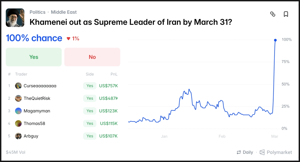 가장 상징적인 계약은 “3월 31일까지 하메네이가 최고지도자 자리에서 물러날까?”였습니다. 이란 국영 방송이 그의 사망을 확인하자 해당 계약은 100% ‘예’로 종료됐고, 거래 규모는 4,500만 달러에 달했습니다. 한 계정은 약 75만 7천 달러를 벌었고, 다른 네 명도 각각 10만 달러 이상 수익을 올렸습니다.