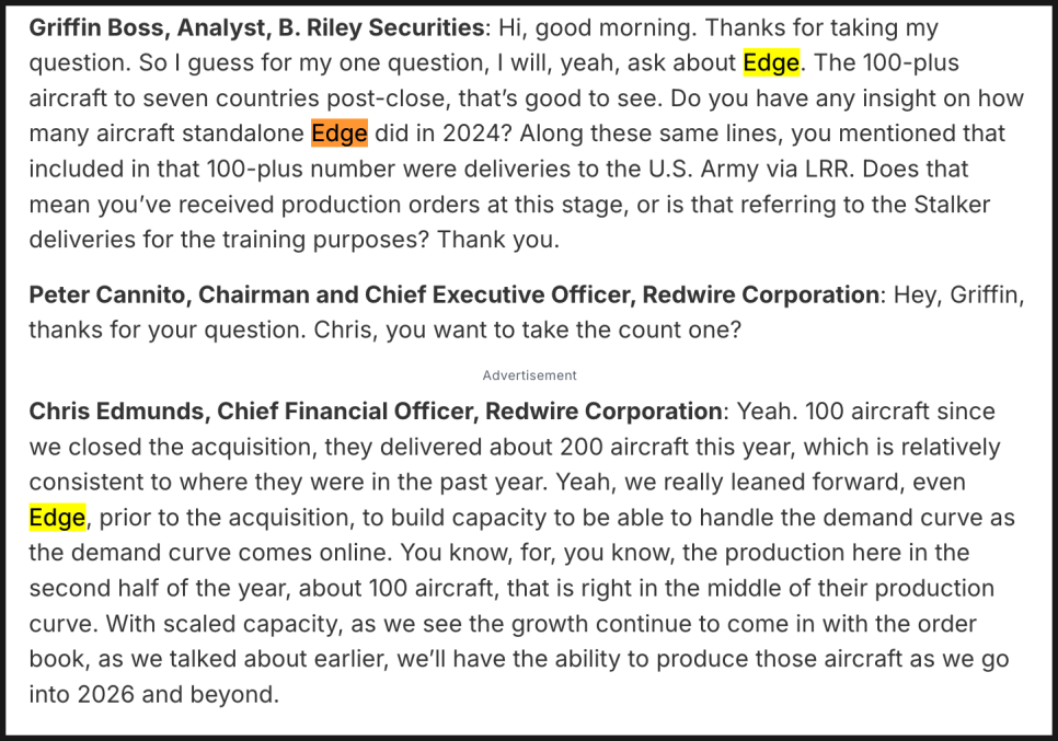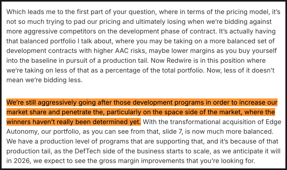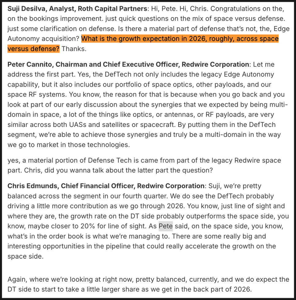 또 하나 흥미로운 부분은 디펜스 테크가 단순히 엣지 오토노미 사업만 의미하지 않는다는 점입니다. 기존 레드와이어의 우주 광학, RF 시스템, 센서 사업도 포함되어 있습니다. 무인기와 위성에 들어가는 기술이 겹치는 부분이 많기 때문에 하나의 세그먼트로 묶는 것이 효율적이라는 설명이었습니다.