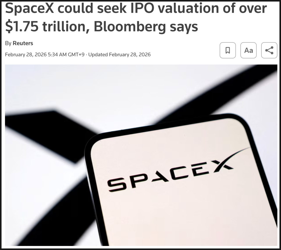 그럼에도 우주 섹터 전반을 올해에도 뜨겁게 달궈놓을 이슈는 여전히 유효합니다. 바로 일론 머스크가 이끄는 스페이스엑스(SpaceX)가 비공개로 상장 신청서를 제출하고 6월 상장을 추진할 수 있다는 보도가 나왔기 때문인데요. 기업가치는 1조 7,500억 달러 이상으로 거론되고 있고, 최대 500억 달러 규모의 IPO가 될 수 있다는 전망까지 나오고 있습니다. 만약 현실화된다면 역사상 최대급 상장이 되는 셈입니다. 스페이스엑스는 차세대 로켓 스타십(Starship), 스타링크(Starlink), 그리고 AI 사업까지 결합한 구조로 확장하고 있으며, 상장 자금은 발사 빈도 확대와 우주 기반 AI 데이터센터, 달 기지 구축 등에 투입될 계획으로 알려졌습니다.