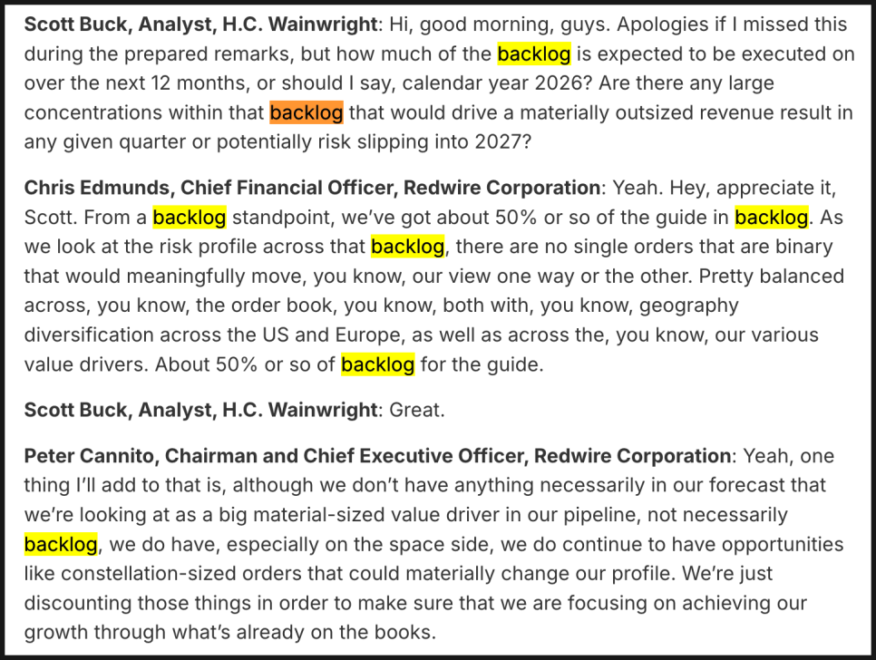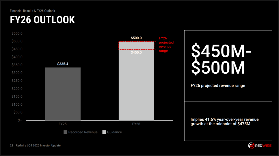 우주·방산 분야에서는 단기 실적보다 수주잔고가 더 중요한 지표로 평가되기도 합니다. 이미 계약이 체결된 물량이 향후 매출로 이어질 가능성이 높기 때문이죠. 현재 레드와이어의 수주잔고는 우주 인프라 사업과 방산 기술 부문을 모두 포함하고 있으며, 사업 포트폴리오가 다변화되고 있다는 점도 특징입니다. 회사는 2026년 매출 가이던스를 4억 5,000만 달러에서 5억 달러 사이로 제시했는데요. 올해 성장 속도가 한층 가속화될 것이라는 경영진의 자신감을 반영한 수치입니다.