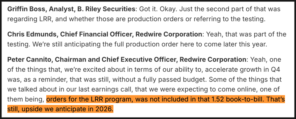 미 육군 LRR(장거리 정찰대) 프로그램 관련 질문에서는 아직 대량 생산 계약은 나오지 않았고, 현재는 시험과 훈련 단계라고 밝혔습니다. 다만 본격적인 생산 주문은 2026년 중 나올 가능성이 있으며, 이 물량은 아직 수주잔고에 반영되지 않았다고 설명했습니다. 즉, 현재 가이던스에는 보수적으로 잡혀 있고, 추가 상승 여지가 있다는 의미입니다.