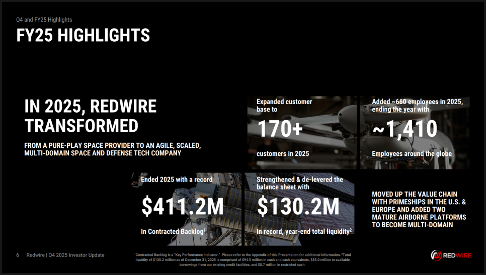 우선 최고경영자 피터 캐니토(Peter Cannito)는 2025년을 “근본적인 체질 변화의 해”라고 규정했습니다. 6월에 엣지 오토노미(Edge Autonomy) 인수를 마무리하면서, 레드와이어는 우주 영역뿐 아니라 방산 무인항공체계(UAS)까지 포트폴리오를 확장했습니다. 그 결과 고객 수는 170곳 이상으로 늘어났고, 임직원 수도 약 1,410명으로 증가했습니다. 단순히 외형이 커졌다는 의미를 넘어서, 이제는 다수의 프라임 계약을 수행하는 ‘멀티 도메인’ 기업으로 자리 잡았다는 점을 강조했죠.