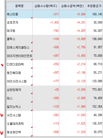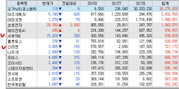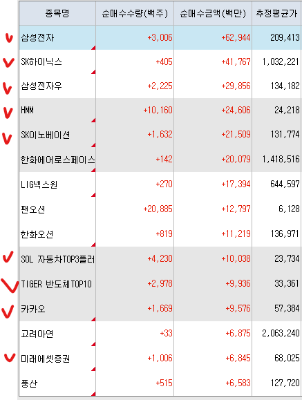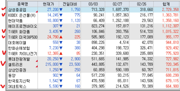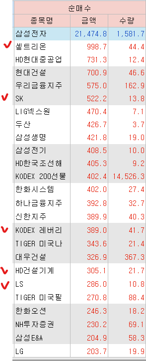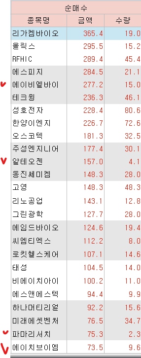 매도 : 두산우 기아 대한항공 대신증권 포스코퓨처엠 현대차 현대차2우B Posco홀딩스 삼성전자(+159.71%) 삼성전자우(+34.17%) 삼성SDI 미래에셋증권(+30.88%) 보성파워텍(+108.18%) 이수페타시스 SOL한국원자력SMR HD한국조선해양 Tiger코리아AI전력기기TOP3플러스 삼성에피스폴딩스 기업은행 케이엠더블유 두산에너빌리티 카카오 엔씨소프트 주성엔지니어링(+122.72%) 바텍 대우건설(+162.0%) 한전KPS LG화학 한전기술 리노공업 LG전자 엘앤에프 KODEX200 이노와이어리스(+51.81%) 제주반도체 유진테크 현대글로비스 에코프로 테크윙 Tiger반도체 SK이노베이션 씨에스윈드 대성에너지 KODEX레버리지 심텍 KODEX코스닥150 에코프로비엠 레이크머티리얼즈 에이비엘바이오 Tiger2차전지테마 SK바이오팜 HD현대중공업 엔켐 LG에너지솔루션 SK스퀘어 HPSP Tiger2차전지TOP10레버리지(+52.99%) PlusK방산 TIMEK바이오액티브 SOL조선TOP3플러스 SOL자동차TOP3플러스 온코닉테라퓨틱스 알지노믹스 Tiger반도체TOP10레버리지