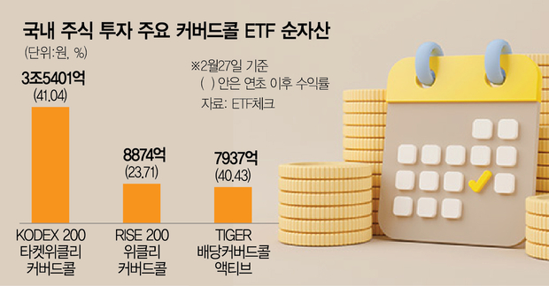 이는 삼성자산운용의 ‘KODEX 200타겟위클리커버드콜’, KB자산운용의 ‘RISE 200위클리커버드콜’, 미래에셋자산운용의 ‘TIGER 배당커버드콜액티브’ 등 국내 주식에 투자하는 커버드콜 ETF의 순자산이 크게 늘어난 영향