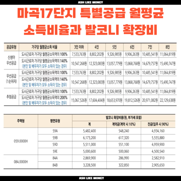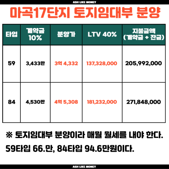 마곡17단지는 최고 16층, 10개동의 총 577세대의 규모로 땅은 공공이 소유하고 건물은 분양받은 사람이 소유하는 토지임대부 분양주택이다. 40년 동안 거주한 뒤 재계약으로 최장 80년(40년 + 40년)까지 거주할 수 있다. 최장 80년이면 손자까지 살 수 있을 정도로 길게 살 수 있지만 전매제한 기간이 10년이라 10년이 지나면 개인 간 거래가 가능하다. 서울 마곡17단지는 서울 2억대의 공공분양이라 장기전세주택이라 생각하면 된다. 토지 임대료 최대 60% 보증금을 전환 신청가능하다.
