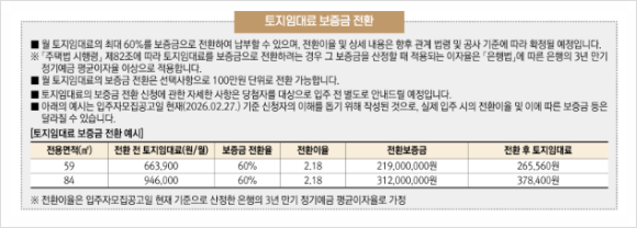공급물량은 381세대로 사전청약 175세대, 특공 162세대, 일반공급 44세대이다. 59타입은 355세대, 84타입은 26세대이다. 59타입 분양가는 3억 4,332만, 84타입은 4억 5,308만원이다. 계약금은 10%, 잔금 90%이고 59타입 토지임대료 66.4만원, 84타입은 94.6만원이다. 대신, 월 토지임대료의 최대 60%까지 보증금으로 전환하여 토지임대료를 적게 낼 수 있다.