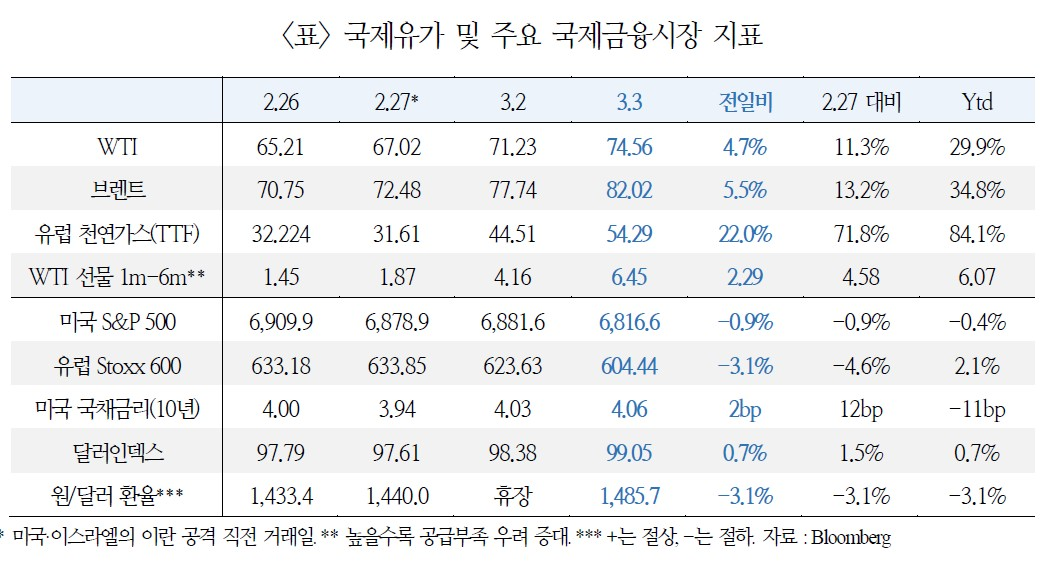 WTI 가격은 3.3일 $74.56으로 전일 대비 +4.7%(중동 사태 이후 +11.3%). 장중 한 때 9% 이상 급등하며 $77.98(작년 6월 미국의 이란 공습 이후 최고치)을 기록하기도 했으나 트럼프 대통령의 호르무즈 해협 호위 발언으로 상승폭이 축소