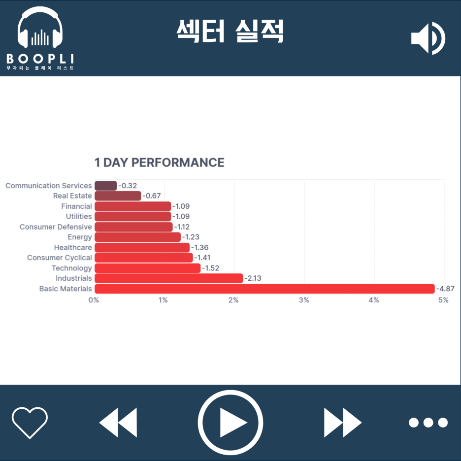 달러 강세로 원자재 섹터가 하락을 주도했고, 이어서 산업재, 기술, 소비 순환재, 헬스케어, 에너지, 경기 방어주, 유틸리티, 금융, 부동산 순으로 약세