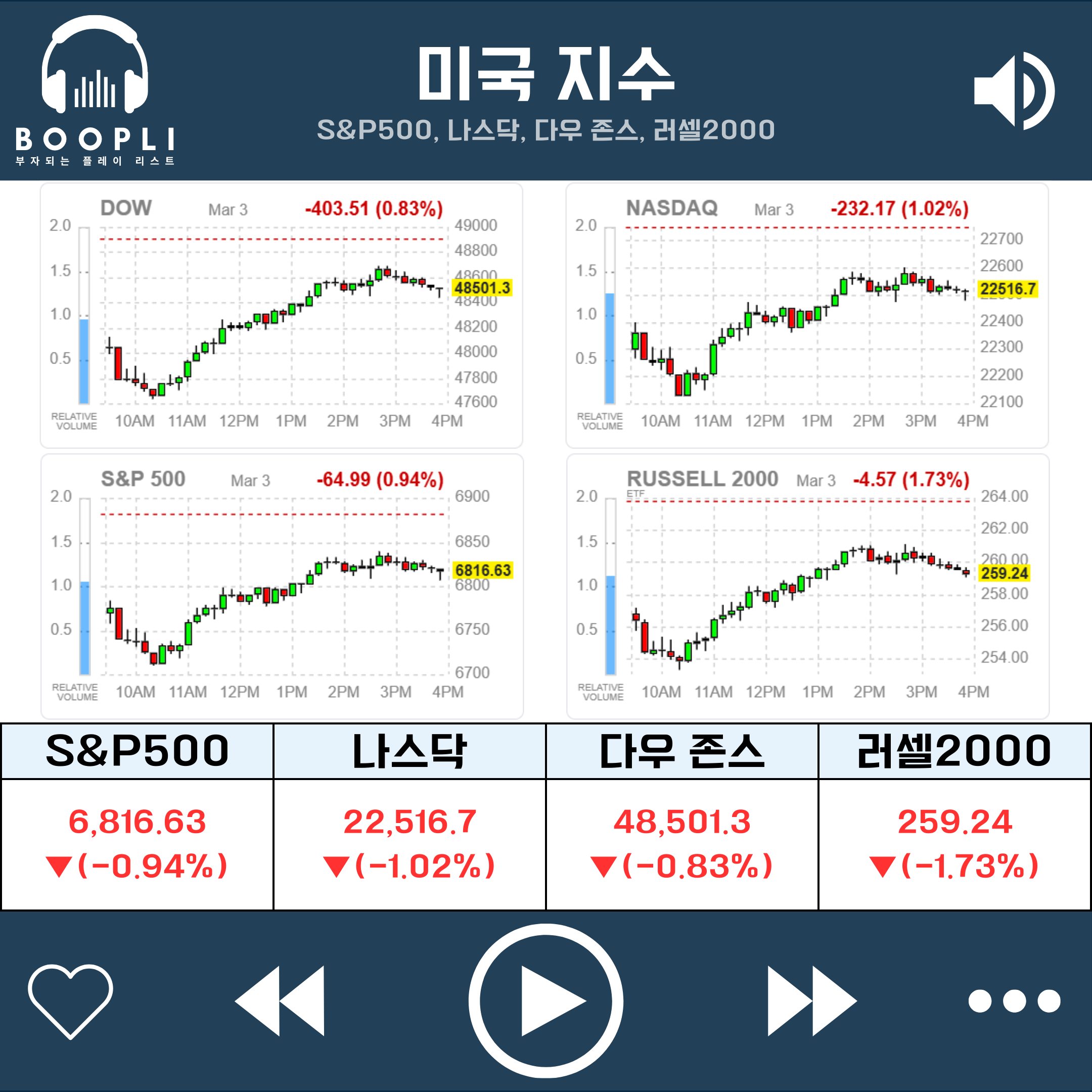 전일 미국 증시는 미–이란 전쟁 격화로 국제유가가 급등하며 인플레이션 압력이 확대된 가운데, 사모신용 리스크까지 부각되며 다우(-0.83%), S&P500(-0.94%), 나스닥(-1.02%), 러셀2000(-1.73%) 등 주요 지수 모두 하락 마감