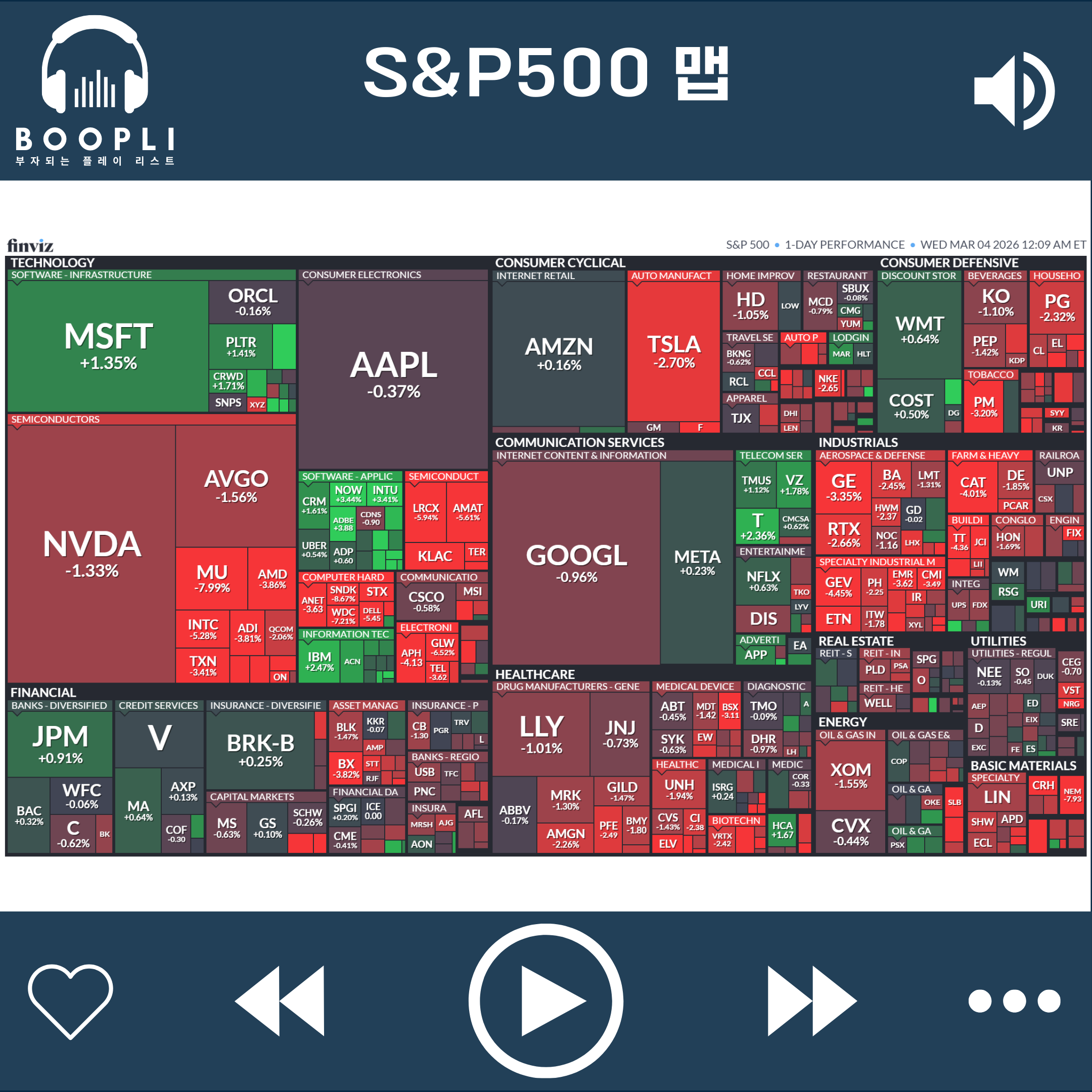 장 후반에는 낙폭을 상당 부분 만회했으나, 전쟁 장기화 가능성과 인플레이션 경로에 대한 불확실성이 지속되며 반등세가 이어지지는 못했고, 결국 주요 지수는 모두 하락한 채 거래를 마침