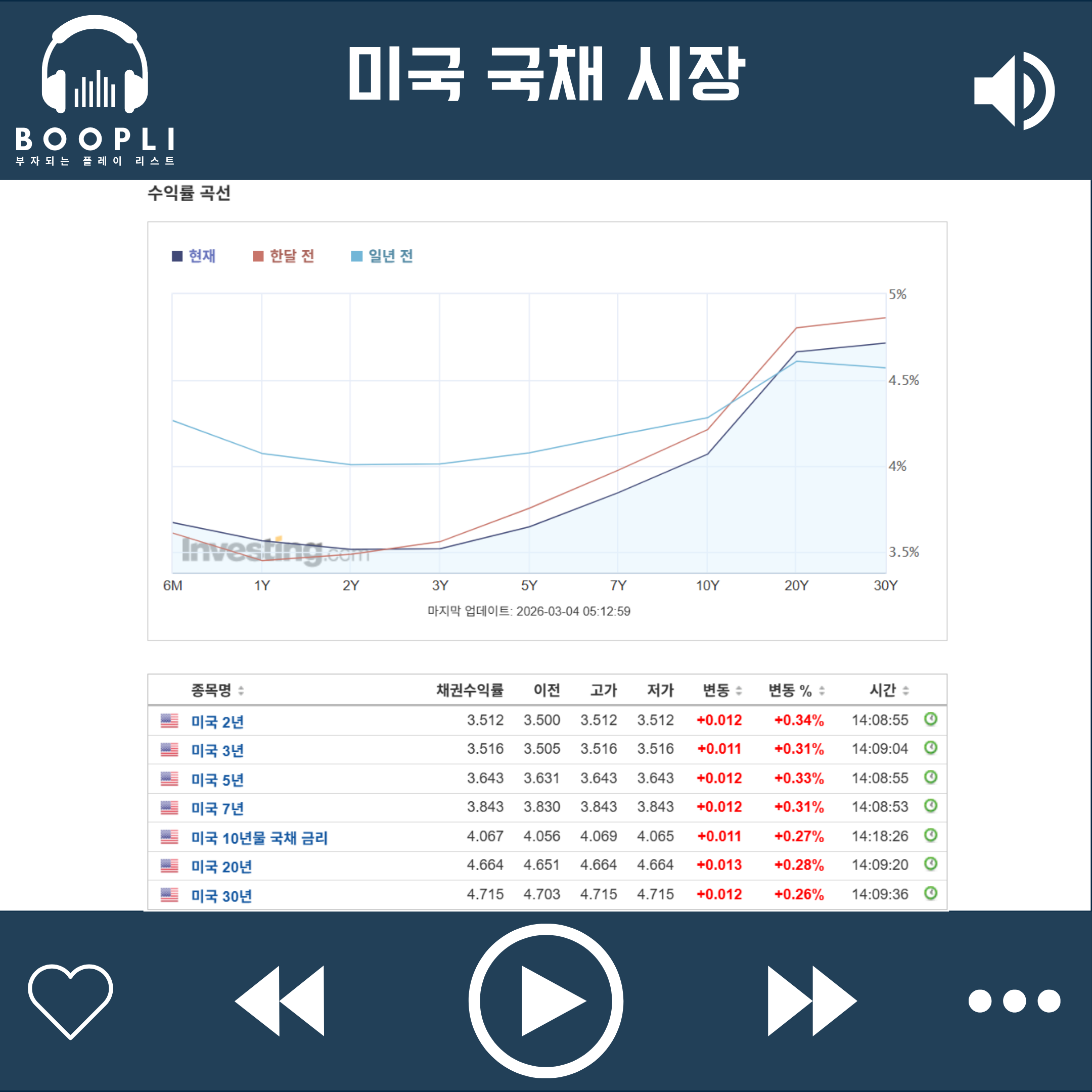 미국 국채는 중동 전쟁에 따른 유가 상승과 인플레이션 우려로 금리 인하 기대감이 후퇴하며 장단기 금리 모두 상승