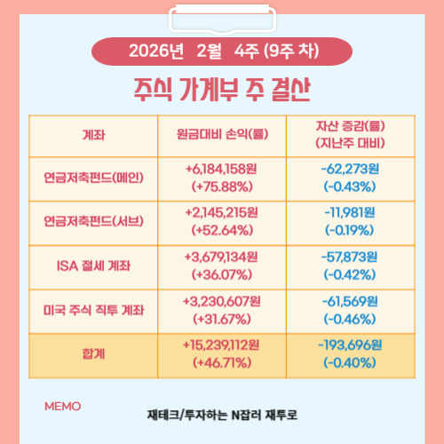2026년 2월 4주 차이자 올해의 9주 차를 맞이하여 제 주식 가계부의 자산 흐름을 면밀히 결산해 보았습니다. 이번 주는 시장의 전반적인 조정 흐름 속에서 제 계좌들도 잠시 숨을 고르는 모습을 보여주었으나 원칙에 입각한 '적립식 매수'를 지속하며 자산의 기초 체력을 튼튼히 다진 시간이었습니다. 주간 단위의 작은 등락에 일희일비하기보다 전체적인 우상향의 궤적을 확인하며 장기 투자의 본질을 되새기는 결산 내용을 공유드리겠습니다.