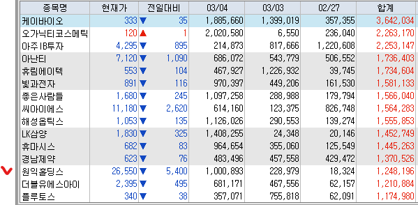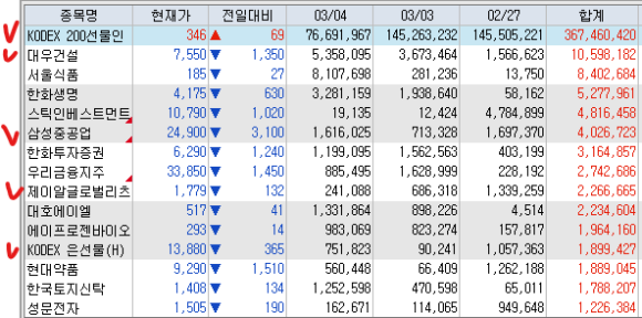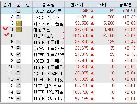 매도 : 삼일제약 SK하이닉스 현대건설(+34.25%) 한화 LX인터내셔널 오리온홀딩스 유안타증권 동진쎄미켐 POSCO홀딩스 삼성전자우(+40.54%) 삼성전자(+140%) NH투자증권 대원전선(+47.03%) 삼성SDI 보성파워텍(+66.87%) 이수페타시스 한화솔루션 LSELECTRIC Tiger코리아전력기기TOP3플러스 한화에어로스페이스 성광벤드 삼성증권 삼성물산 HLB 팬오션 KT 제룡전기 LG화학 리노공업 현대로템 KODEX200 금호타이어 이노와이어리스(+36.35%) 현대글로비스 테크윙 상아프론테크 Tiger반도체 대성에너지(+58.85%) KODEX골드선물 피엔티 RFHIC(+46.59%) 에이피알 노바텍 피에스케이(+70.17%) 하이브 가온칩스 ACEKRX금현물 Tiger2차전지TOP10레버리지 대한조선(+36.88%) PLUSK방산 SOL자동차TOP3플러스 Tiger반도체TOP10레버리지 Kodex200타겟위클리커버드콜 KODEX금융고배당TOP10타겟위클리버커드콜