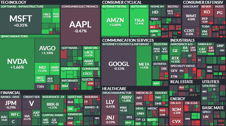 주요 지수들은 전반적으로 상승세를 기록했지만 섹터별로는 뚜렷한 차별화 장세가 나타났습니다. 기술주 중심의 나스닥이 1.29% 오르며 상승을 주도했고 S&P 500과 다우 지수 역시 각각 0.78%와 0.49% 상승하며 완만한 우상향 곡선을 그렸습니다. 특히 반도체와 소프트웨어 섹터에서는 엔비디아와 브로드컴 그리고 마이크론 테크놀로지 등이 1%에서 5%대 이상의 강세를 보이며 기술적 우위를 점한 기업들에 대한 매수세가 여전히 견고함을 증명했습니다. 반면 애플이나 알파벳 등 일부 빅테크 기업들과 에너지 섹터는 국제 유가 변동성 및 정책적 리스크에 노출되며 상대적으로 부진한 모습을 보였고 금융 섹터 역시 스테이블코인 규제 논란의 영향으로 혼조세를 나타내며 시장의 양극화 현상을 여실히 보여주었습니다.
