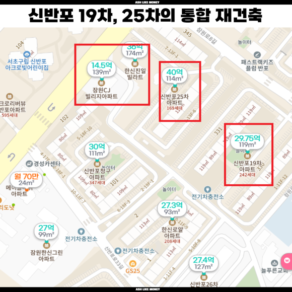 신반포 19차, 25차가 있는 부지는 3호선 잠원역 초역세권이며 한강뷰도 가능하다. 아쉬운 것은 세대수가 작다는 것이지만, 브랜드 가치가 높아진다면 그것을 상쇄할 지도 모른다. 신반포 19차와 25차는 현재 34평 이상이 33억~40억이라 평당 1억을 기록하고 있다. 해당 부지 뒤에는 공터와 노포부지가 있는데 금싸라기 땅에 향후 초등학교가 탄생할 부지라고 하는데, 초등학교가 탄생하면 초품아, 역세권, 브랜드, 평지, 한강뷰까지 가능한 아파트가 될 것이다.
