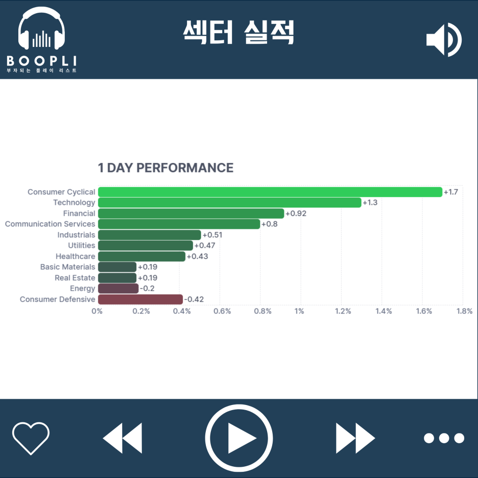 소비 순환재 섹터가 상승을 주도했고, 이어서 기술, 금융, 커뮤니케이션 서비스, 산업재 순으로 강세