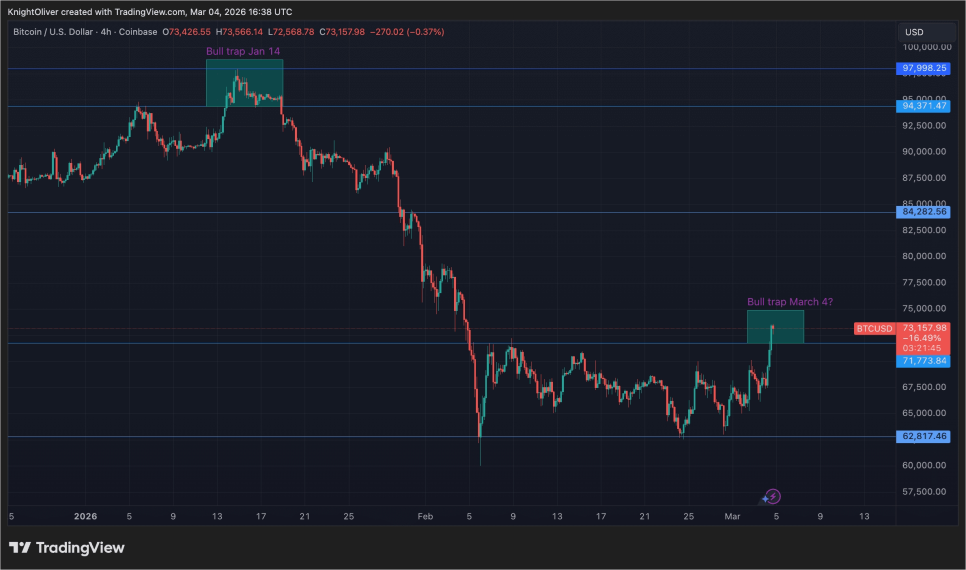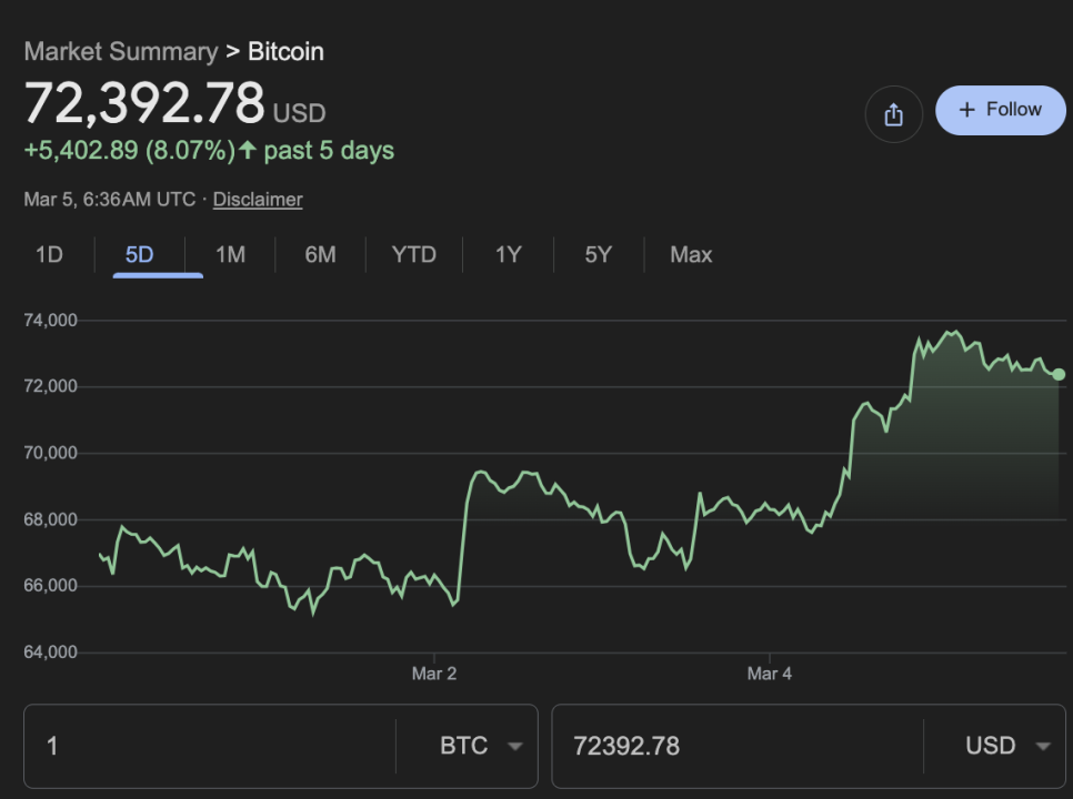 지난 몇 주 동안 7만 달러 아래에서 지지부진하게 횡보하던 비트코인이 3월 4일 하루 만에 8% 가까이 급등하며 한때 7만 4천 달러까지 돌파했습니다. 약 한 달 만에 처음으로 회복한 수준입니다.