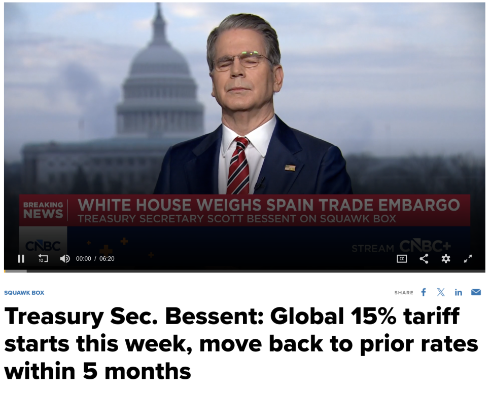 스콧 베센트(Scott Bessent) 재무장관은 15% 글로벌 관세가 이번 주부터 시작될 수 있다고 언급했고, 이란 관련 지정학적 긴장도 고조되고 있습니다.
