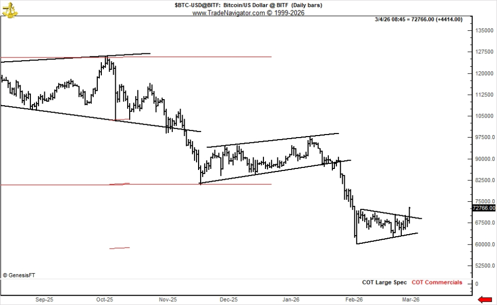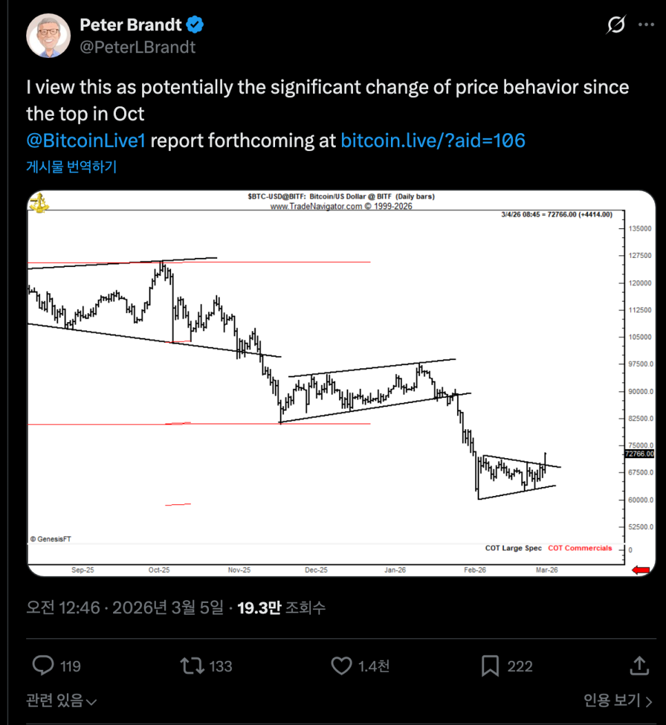 베테랑 트레이더들의 시각도 변하고 있습니다. 오랫동안 비트코인에 비관적인 입장을 유지해 온 피터 브란트(Peter Brandt)가 X에 "10월 고점 이후 처음으로 가격 흐름에 의미 있는 변화가 생길 수 있다"고 밝혔습니다. 브란트는 불과 얼마 전까지만 해도 2026년 10월을 장기 사이클 바닥으로 예상했던 인물인데, 그런 그가 시각을 바꿨다는 건 적지 않은 의미가 있습니다.