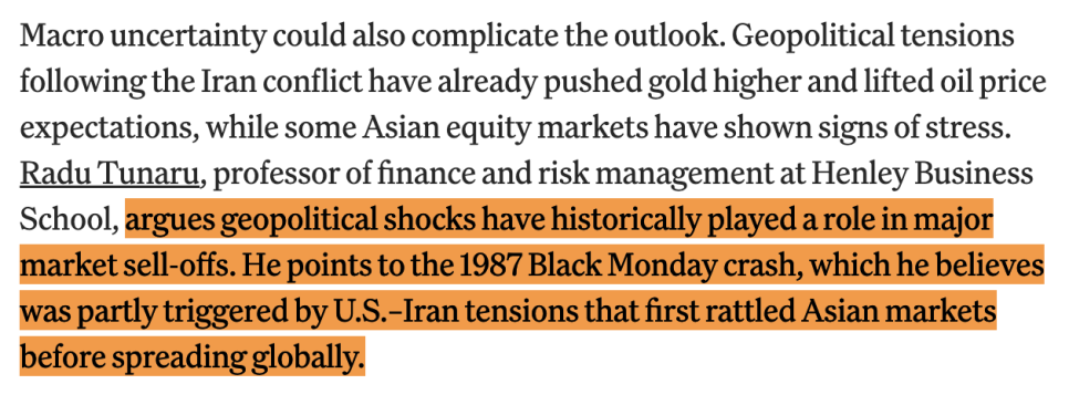 헨리 경영대학원의 라두 투나루(Radu Tunaru) 교수는 지정학적 충격이 역사적으로 대형 시장 붕괴의 방아쇠가 된 경우가 많았다고 지적합니다. 1987년 블랙먼데이도 미국과 이란의 긴장이 아시아 시장을 먼저 흔든 뒤 전 세계로 번졌다는 시각이죠.