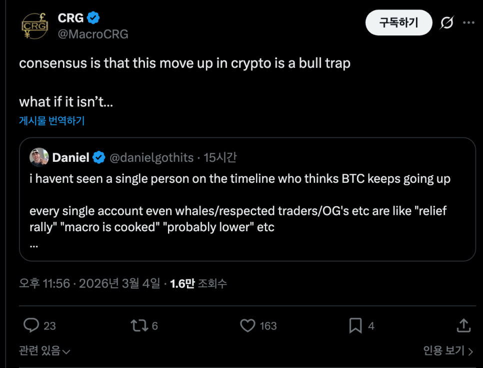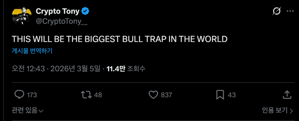 그러나 시장은 이 모든 긍정적 신호에도 불구하고 마냥 흥분하지 않는 분위기입니다. 오히려 크립토 시장 곳곳에서 "이건 불 트랩(bull trap)일 수 있다"는 경고가 동시에 나오고 있습니다. 불 트랩이란, 가격이 반짝 돌파한 것처럼 보여 뒤늦게 매수한 투자자들을 끌어들인 후 다시 급락하는 패턴을 말합니다.